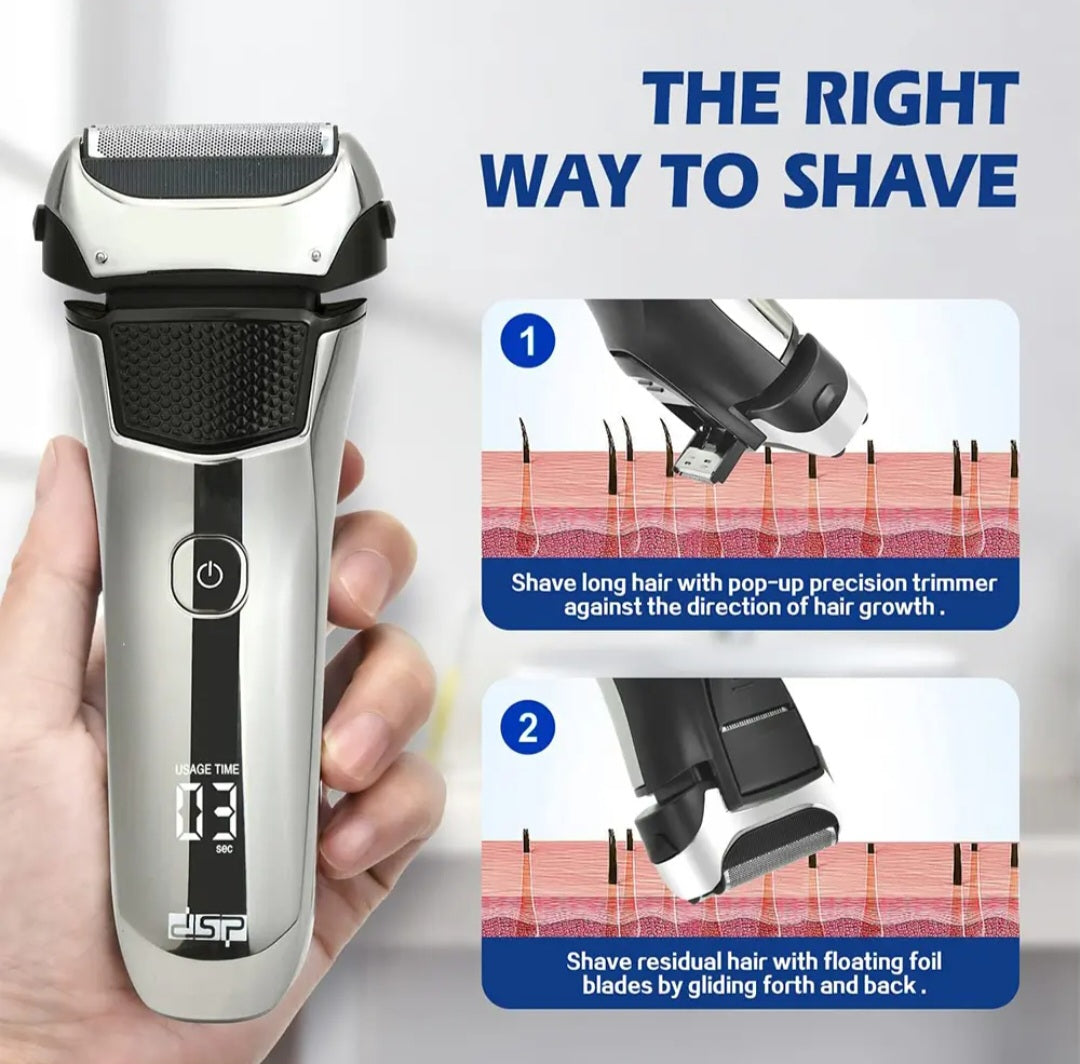 DSP aparat za brijanje usvaja sistem plutajućeg furnira, koji može lako da obrije različite uglove lica, sveobuhvatno očisti ostatke lica i duboko se brije, što je čisto i nežno. IPKS6 vodootporan, možete koristiti penu ili gel za brijanje pod tušem. Trajanje baterije je 100 minuta nakon punjenja oko 2 sata. Akumulatorski aparati za brijanje za muškarce opremljeni punjenjem tipa C mogu se puniti bilo gde (kao što su automobil, računar, zidna kocka, itd. ) preko USB portala. LED ekran može lako da proveri procenat snage, tako da možete napuniti na vreme kako biste izbegli nestanak niske struje tokom upotrebe