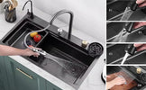 4 Režima pražnjenja vode: Potpuno nova slavina na izvlačenje, svestrano čišćenje od 360° , dužina rastezanja od 30-50 cm, uključujući 3 režima ispuštanja vode, plus režim vodopada, velika površina za čišćenje, nežno i bez prskanja, lako da se nosite sa različitim scenama pranja, što značajno olakšava Vaš posao u kuhinji!