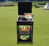 Prenosivi plinski šporet sa 4 gorionika sa individualnim podešavanjem plamena Automatsko paljenje – jednostavno i brzo aktiviranje Jak toplotni učinak: 12.000 BTU – brzo zagrevanje i ravnomerno kuvanje Štitnik od vetra – stabilan plamen čak i pri spoljašnjim uslovima Stabilno postolje sa nogarama – bez klizanja i pomeranja Dvoslojna polica – za odlaganje posuđa, začina, pribora i namirnica