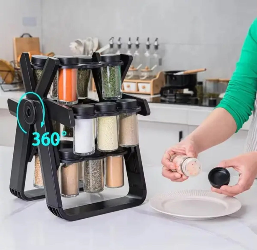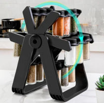 Rotirajući stalak za začine sadrži 18 teglica za začine i namirnice za svakodnevnu upotrebu: so, biber, papriku, semenke, kari i druge začine.