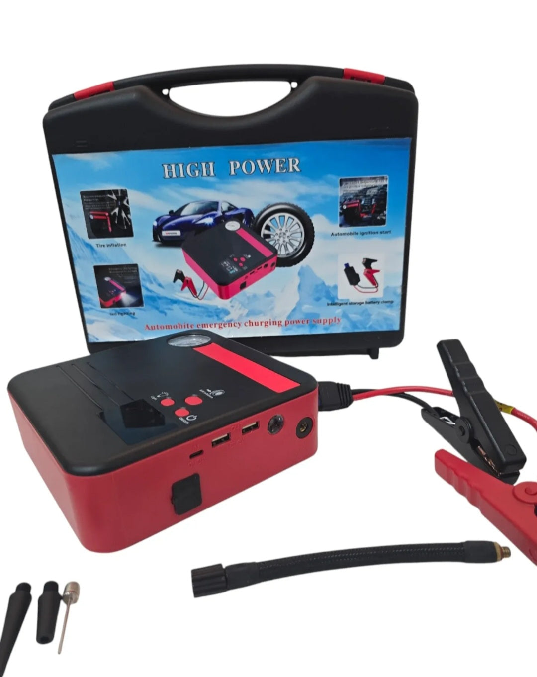 Uredjaj za startovanje automobila u slucaju nuzde. Ugradjena pumpa kompresor za gume i led svetlo. Ovaj starter moze sluziti i kao powerbank tako da preko njega mozete puniti mobilne telefone.